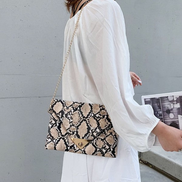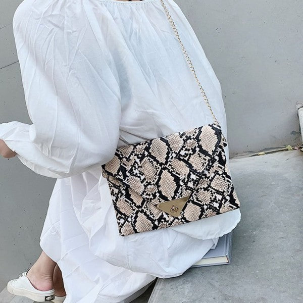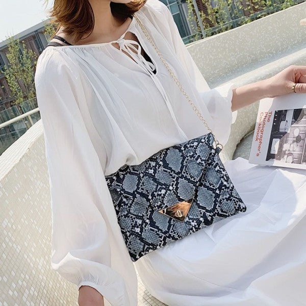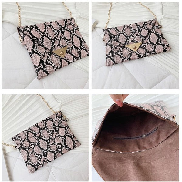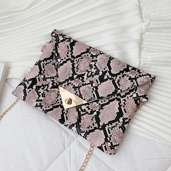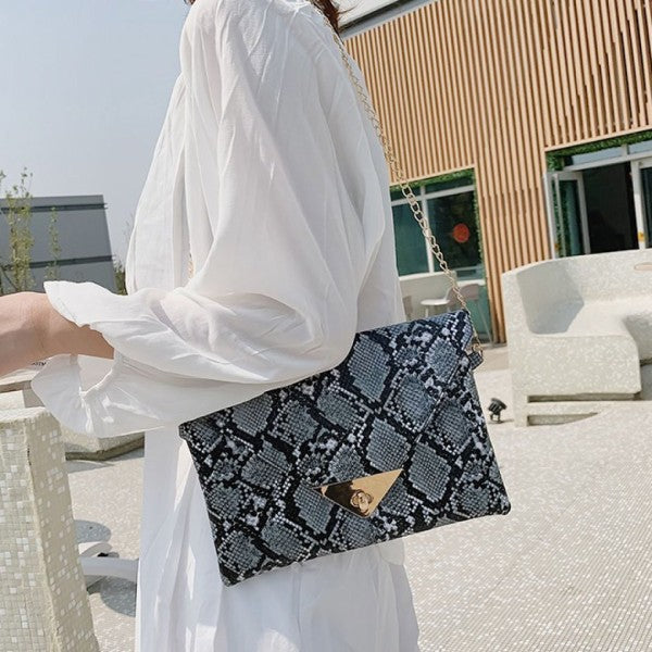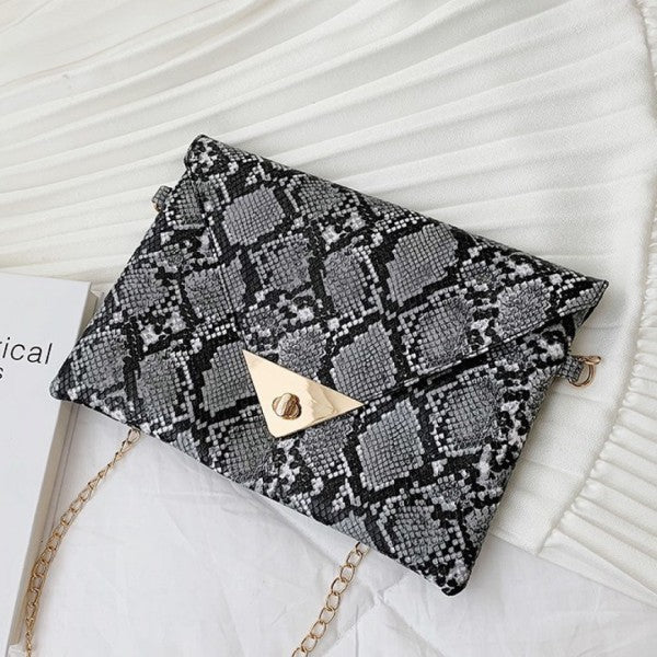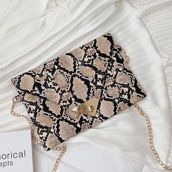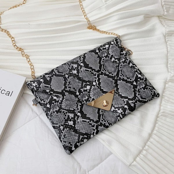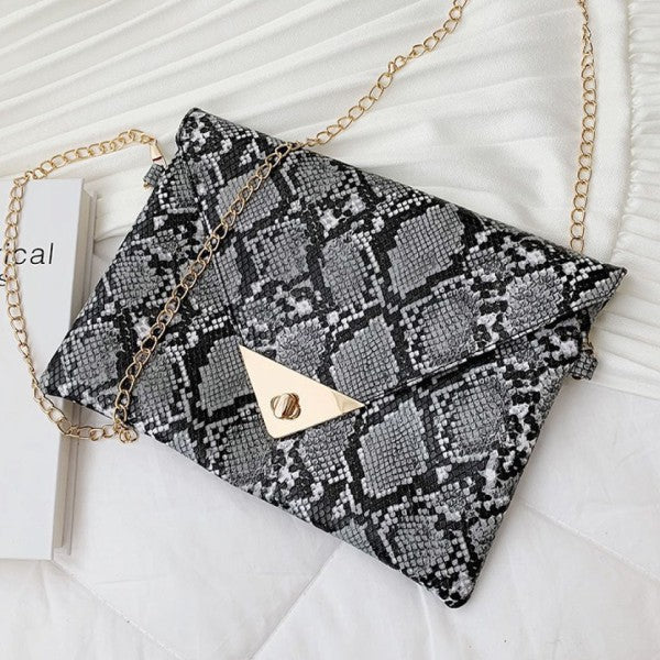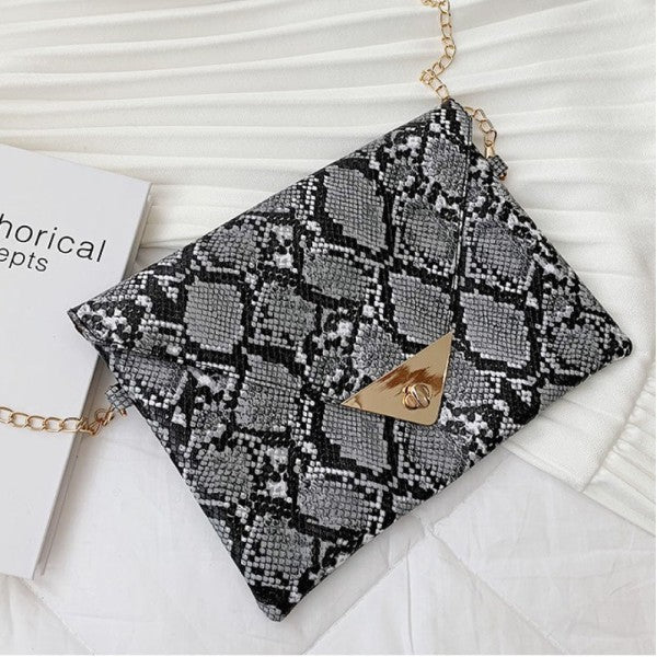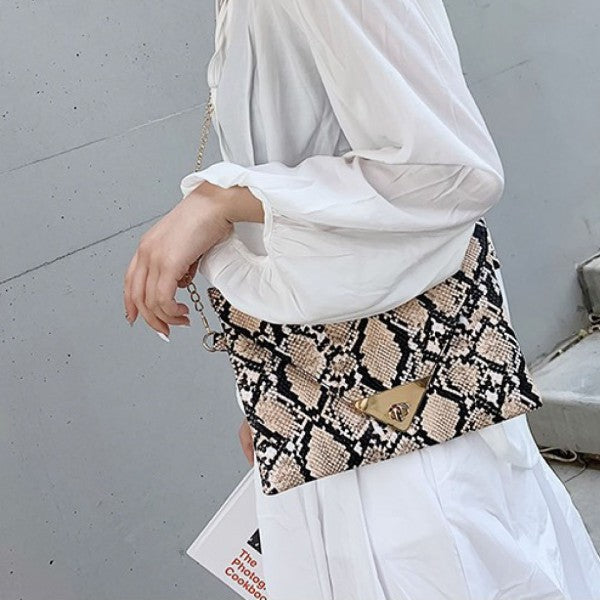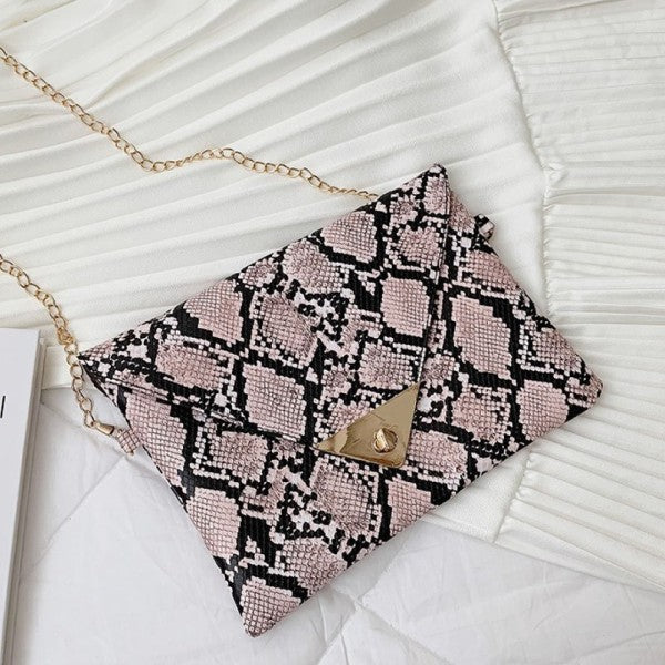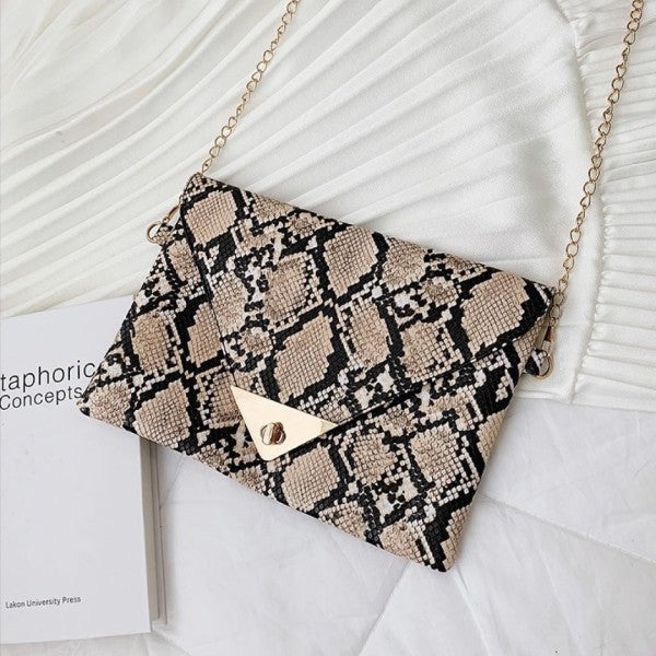 Trendy snakeskin print clutch with clean-cut lines and metallic detail on flap.