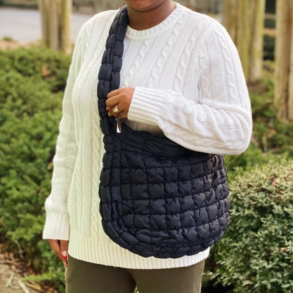 The Carry All Quilted Cross body Bag is the essential accessory for effortless chic. Featuring a lightly padded and stylishly quilted design, this bag offers a large capacity that can fit a laptop, iPad, notebooks, and more. The versatile strap allows for comfortable shoulder or across body wear. Elevate your style and organization with this must-have bag.