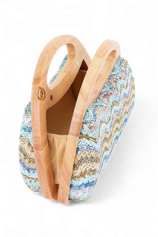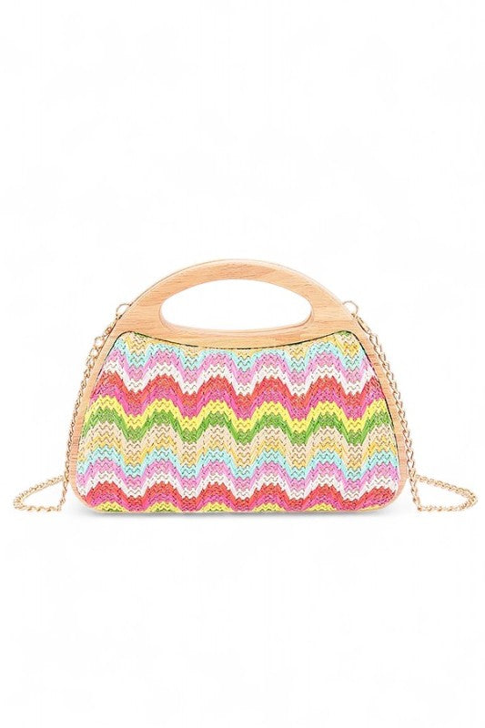 Chevron Print Faux Straw Wodden Frame Clutch Bag