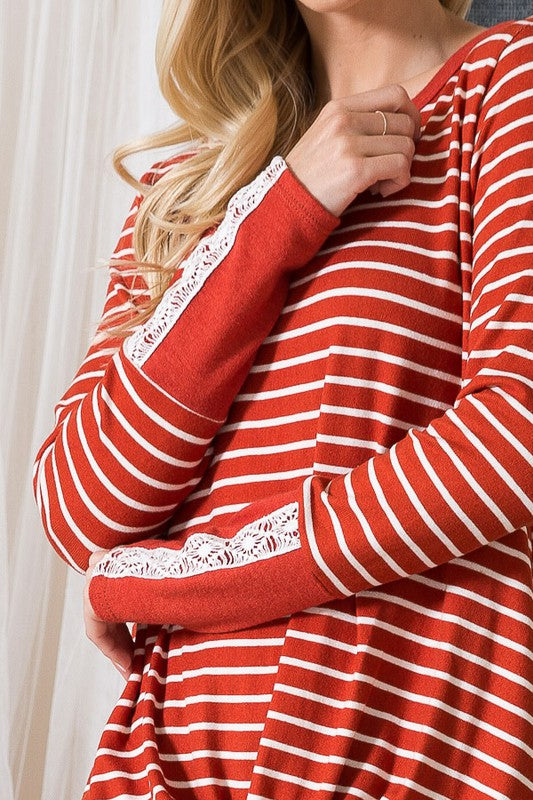 Stripe, light sweater knit top with front twist. Lace trim sleeve detail.
