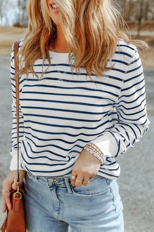 Elevate your style with this trendy long sleeve top featuring a timeless striped print and playful ribbed accents at the cuffs, neck, and hem. Its flattering fit is perfect for all body types and the versatile long sleeves make it a must-have for any season, except for summer.