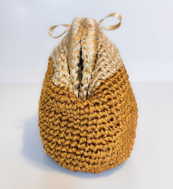 Handwoven in two soft tones of satin ribbon, Saint Nympha features a gently structured, padded body with a gathered top closure. Its curved silhouette offers roomy softness without rigidity, perfect for everyday moments that call for grace and intention. It includes a removable woven long strap, allowing you to wear it your way.