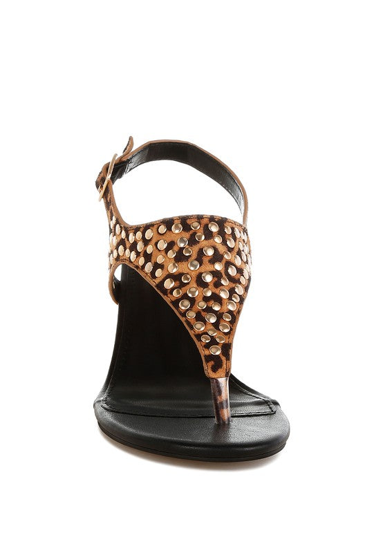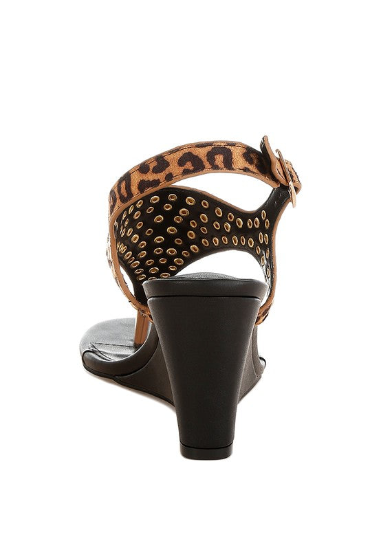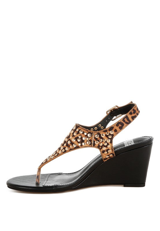 Switch up your everyday looks with these exceptional standout wedges. They come with a bold leopard print, metallic stud accents, and a roomy round toe with a thong detail. Exclusive yet comfortable, they're the perfect pair to wear all day, all season!