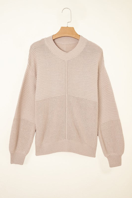 Ribbed Patchwork Textured Knit Puff Sleeve Sweater