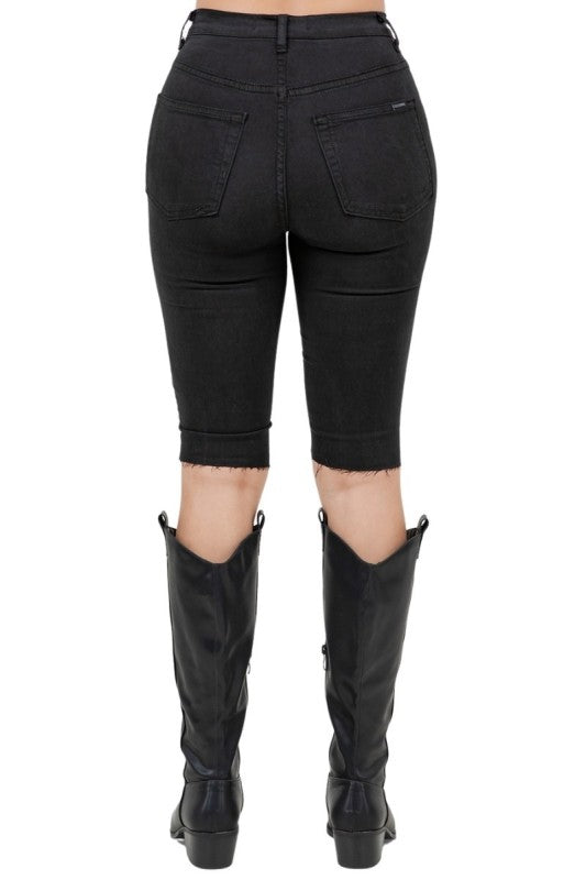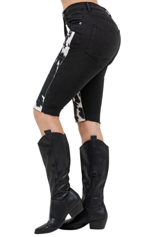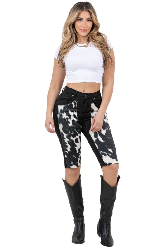 Saddle up in our Rodeo Bell Bottom Capri Short! These playful Western-inspired Shorts feature front faux Cow hide fabric, a comfy 5 pocket design, and front button and zipper closure. Inseam Length 13\", Rise 10\". Raw hem detail. Made in the USA with stretch denim, they're both stylish and comfortable. Get ready to moo-ve over your basic jeans!