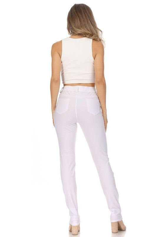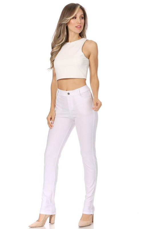 Stretchy, pull up, full length jeggings with belt loops, pockets, and button accent