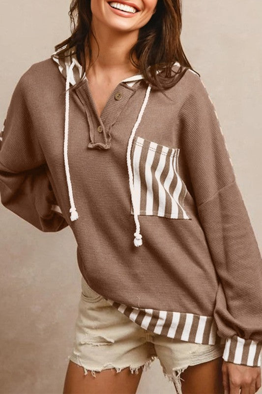 Bring playful charm to your casual wardrobe with this hoodie. Crafted from cozy waffle knit, it features a relaxed fit, drop shoulders, and a stylish patchwork that adds a classic vibe. The buttoned neck and drawstring hood make it easy to layer, perfect for quick, comfy wear with a fun twist. Polyester/Cotton