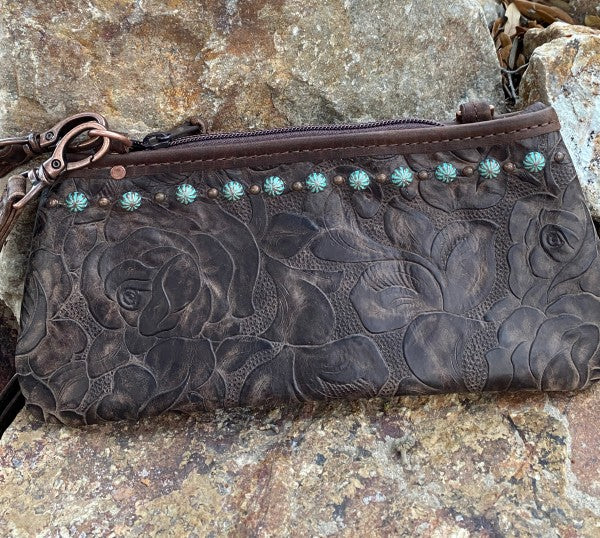 Little clutch with vintage rose leather on front and back, chocolate pull-up trim and long adjustable strap, alternating patina parachute dots and antique copper dots along top border. Also includes a built in wallet insert sewn on inside back and a top zipper closure.