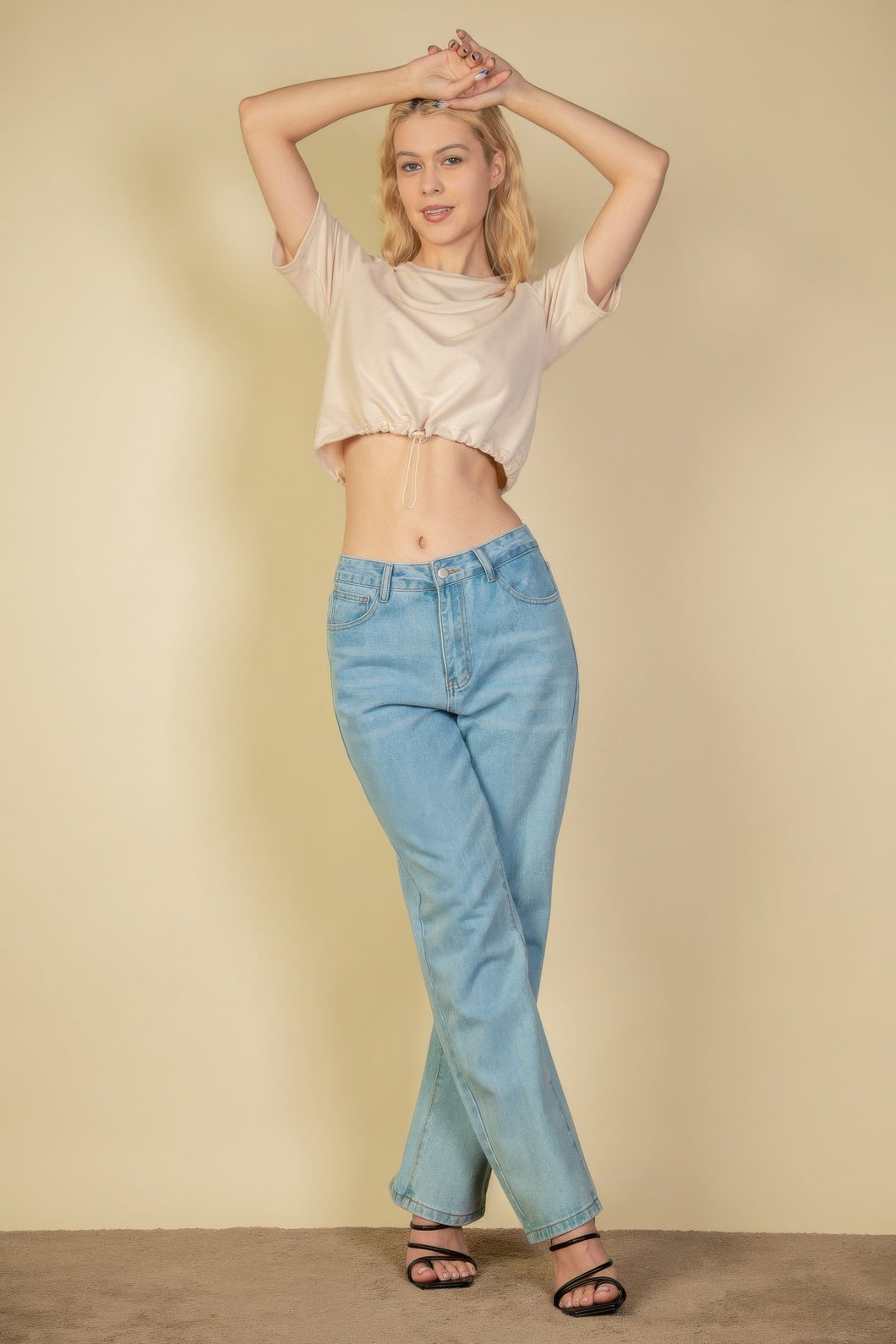 Design: The toggle drawstring detail at the hem adds a functional and stylish element to the simple, relaxed silhouette of the crop top.