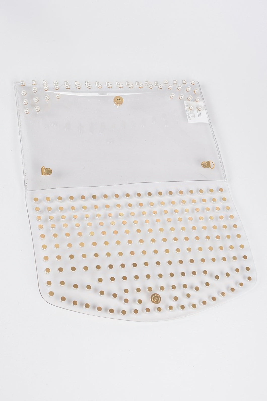 Refined yet playful, the Faux Pearl Studded Transparent Envelope Clutch is a standout statement piece. Featuring a clear body with faux pearl accents, this clutch blends modern transparency with classic elegance. Its envelope shape offers just enough structure while keeping the look light and fresh. Perfect for weddings, date nights, or dressy events.