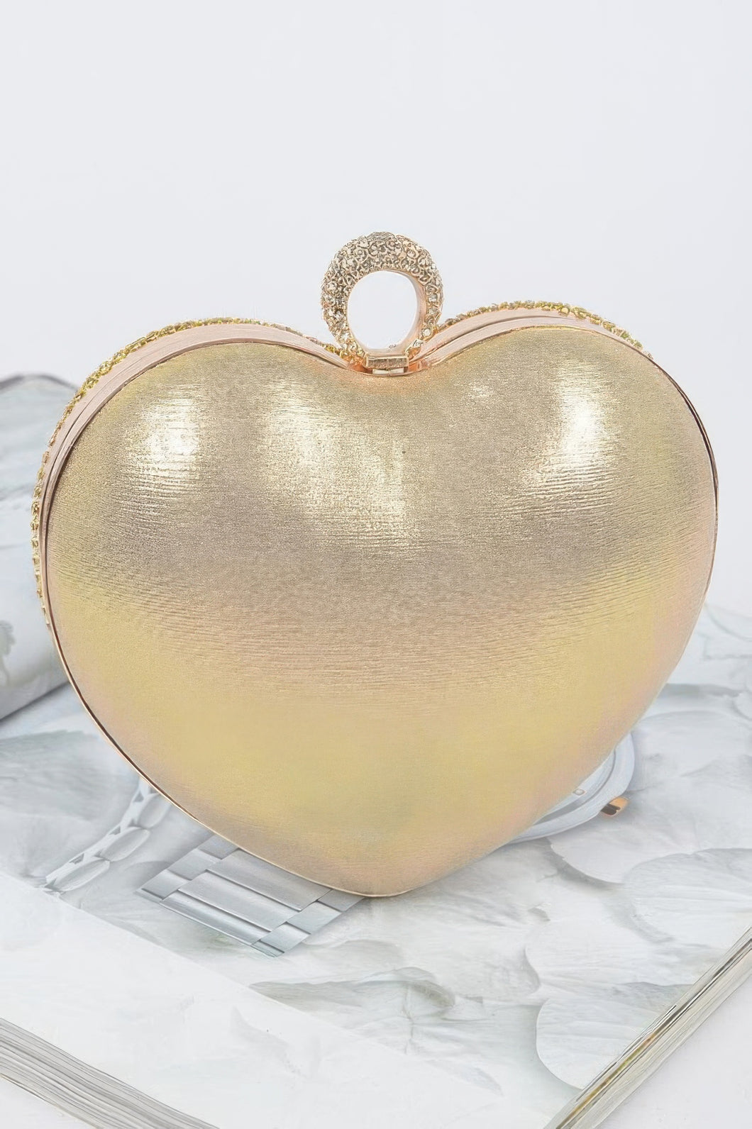Turn up the glamour with the Rhinestone Heart Shape Party Clutch. This dazzling accessory features a radiant heart-shaped silhouette fully encrusted with rhinestones and a gleaming gold chain. Its structured frame adds sophistication, making it perfect for weddings, galas, or nights out. Let your style shine with a clutch that captures the essence of celebration and sparkle.
