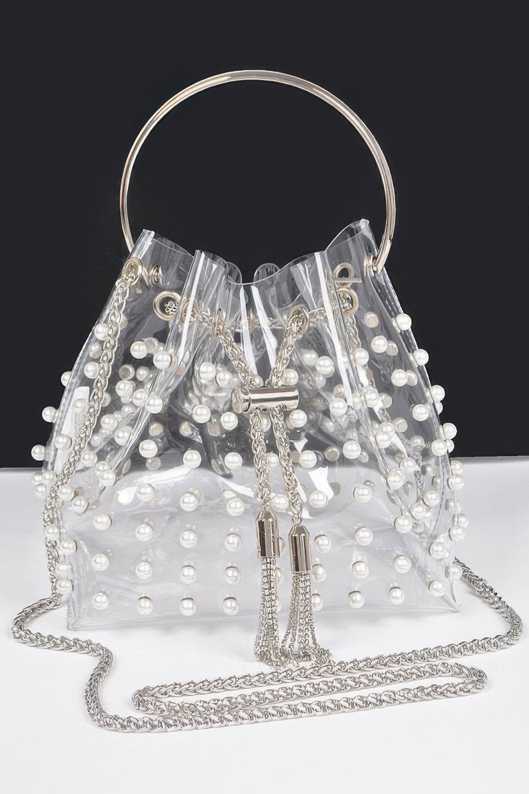 Clear Pearl Stud Bucket Bag W/chain Tassle
