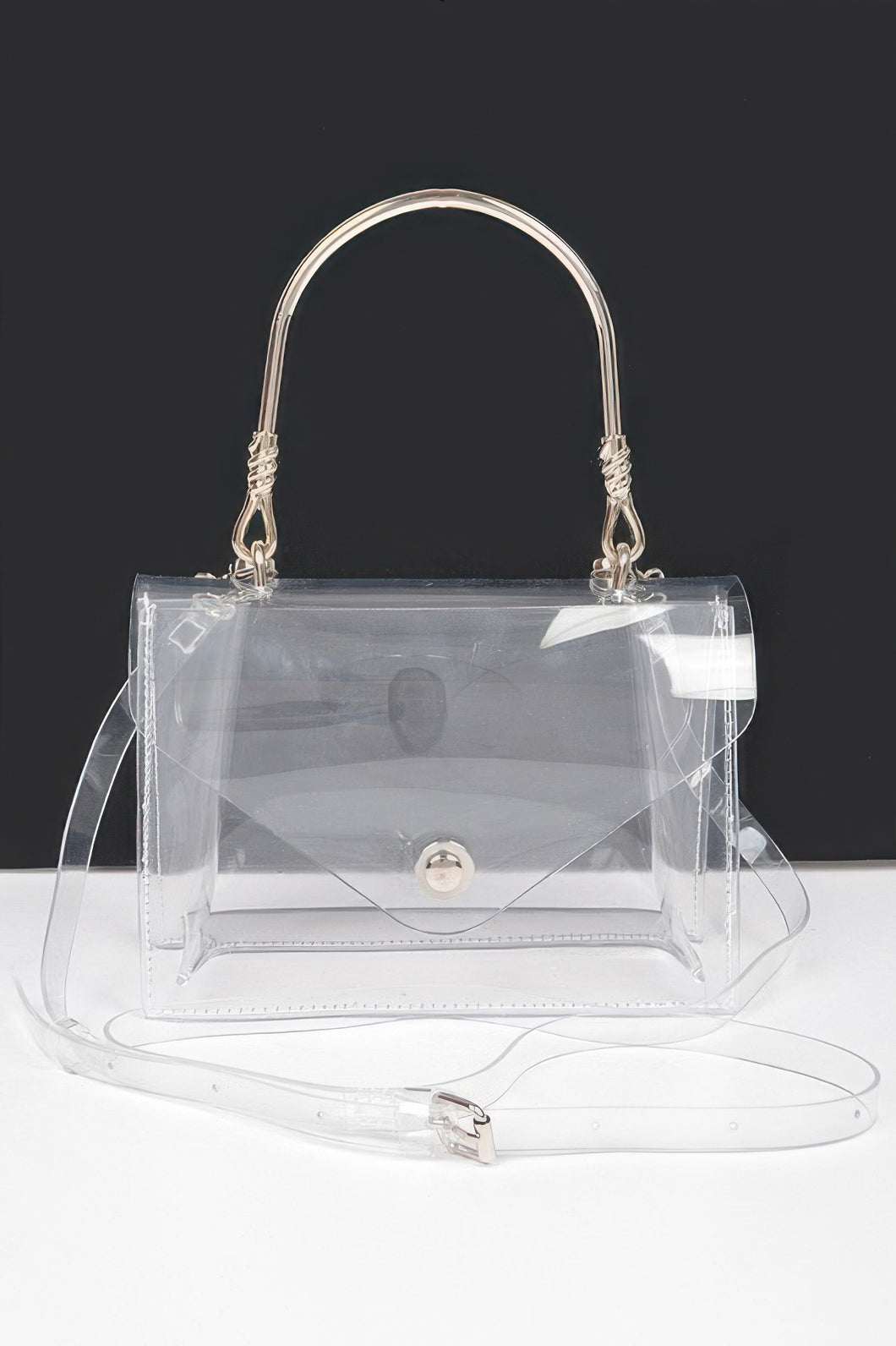 Modern and elegant, the Transparent Metal Handle Flap Clutch brings a sleek edge to your accessory game. Crafted from clear PVC with a chic metal handle and chain, this structured clutch is perfect for showcasing your essentials with contemporary flair. From daytime brunch to evening events, it offers refined versatility.