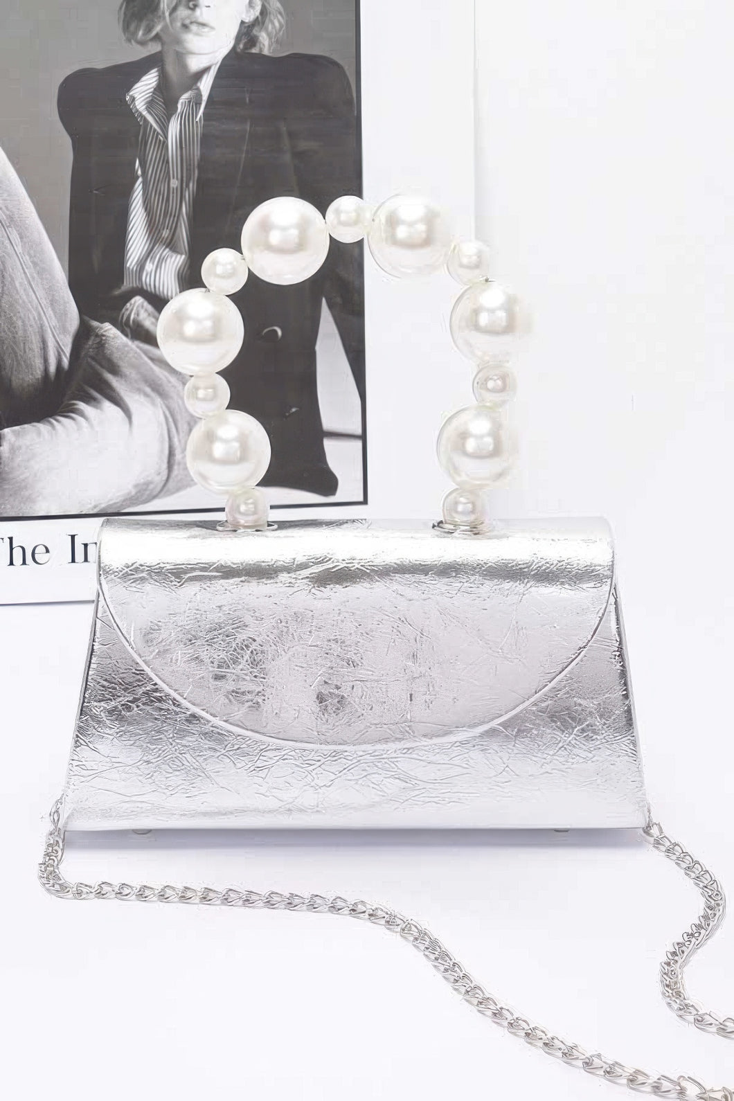Add a refined touch to your evening ensemble with the Metallic Pearl Handle Flap Bag. Designed with a sleek silhouette and elevated by a lustrous pearl-accented handle, this clutch is the epitome of understated glamour. The metallic finish adds just the right amount of shine, while the structured form keeps your essentials secure and stylishly stored. Whether you're attending a formal event or a chic dinner, this piece brings elegance and charm to every occasion. Crafted with quality materials, it’s a timeless addition to your accessory collection.