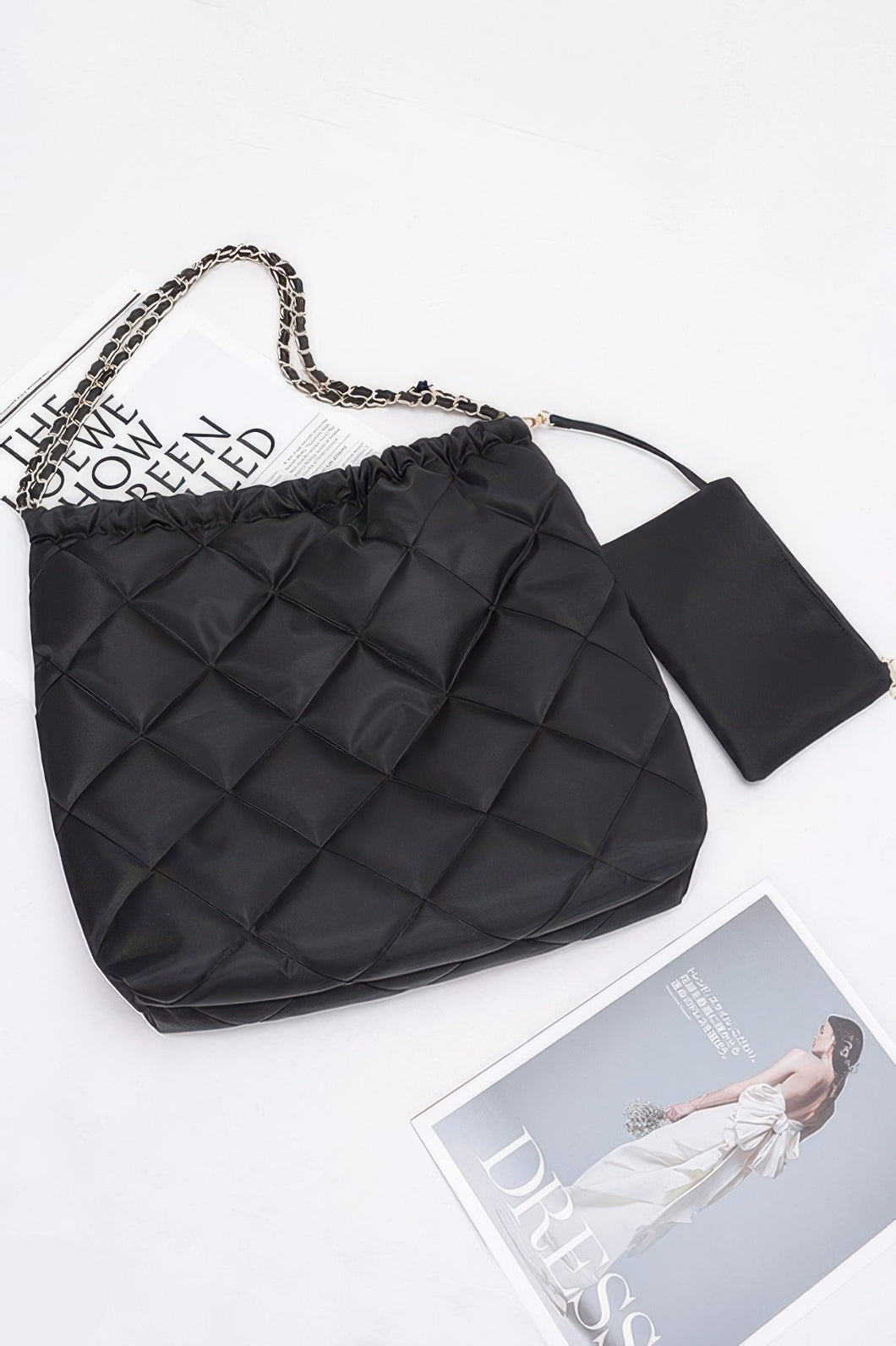 Sophisticated and versatile, the EleganceLink Shoulder Bag is crafted with quilted padding and finished with a sleek chain strap. Its spacious design and polished look make it the perfect companion for both errands and evening events. With a detachable mini bag for added functionality, this bag delivers elegance and practicality in one.