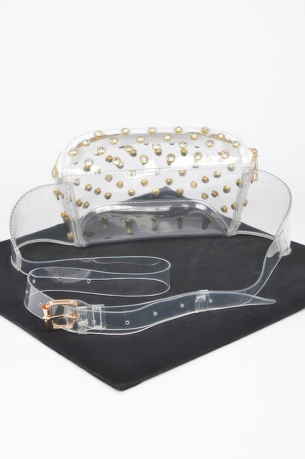 Turn heads with the Transparent Rhinestone Studded Fanny Pack—a bold blend of glam and utility. Crafted from clear PVC and accented with shimmering rhinestone studs, this standout accessory delivers edgy style with a modern twist. Measuring 8.5 inches wide, 5 inches high, and 2.5 inches deep, it offers just the right amount of space for your essentials. The adjustable strap provides flexible styling options, allowing you to wear it around your waist or as a crossbody. Perfect for music festivals, concerts, or any occasion where fashion meets function.