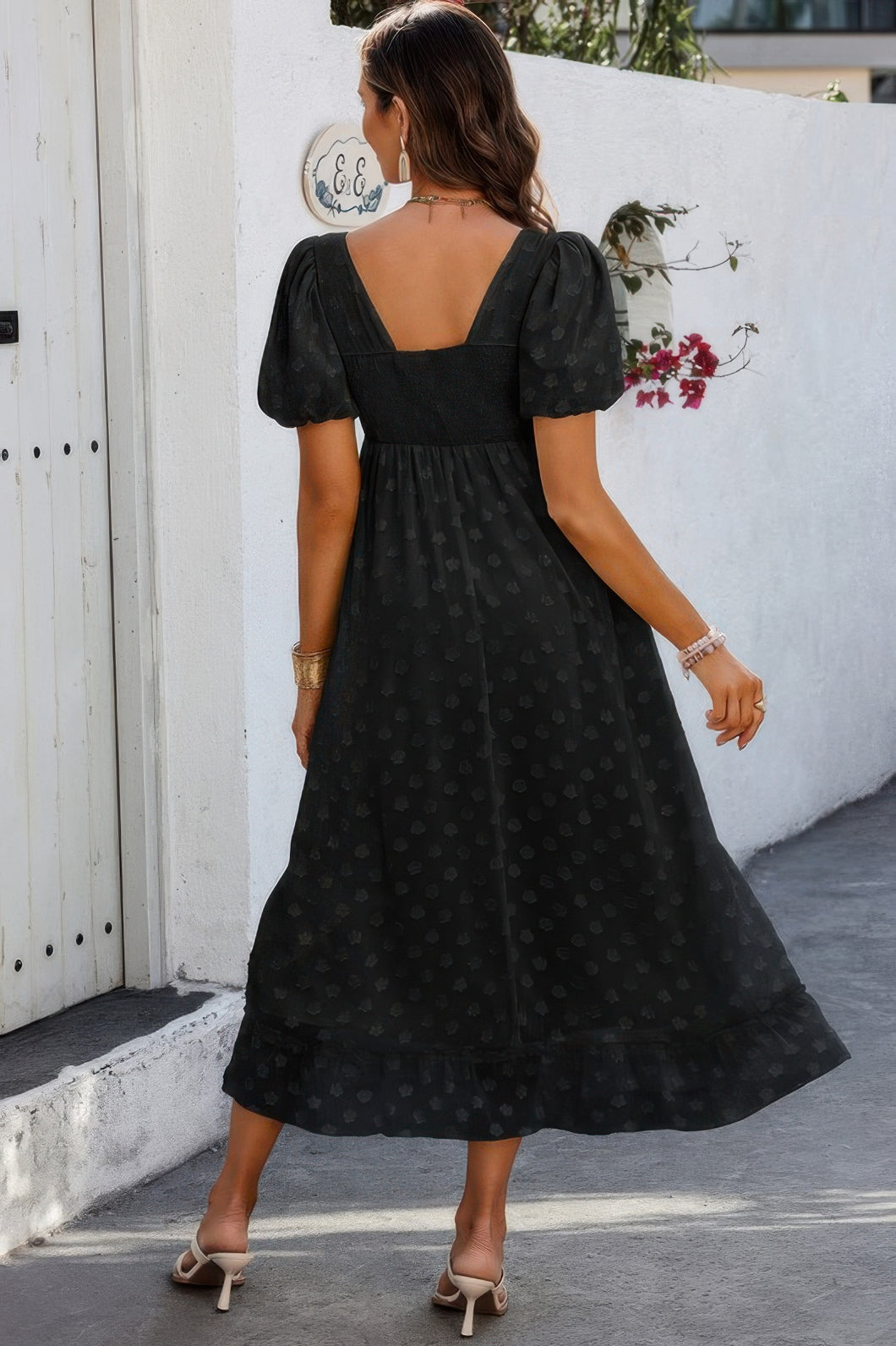 Bring timeless charm to your wardrobe with this square neck Swiss dot ruffle puff sleeve dress, designed for a feminine and flattering look. Crafted from soft, comfortable fabric, this dress features delicate Swiss dot texture, a graceful square neckline, and playful ruffle puff sleeves. The relaxed fit and lightweight feel make it perfect for casual outings, vacations, or weekend get-togethers. Versatile and effortlessly chic, this dress pairs beautifully with sandals or flats for an easy, polished style.