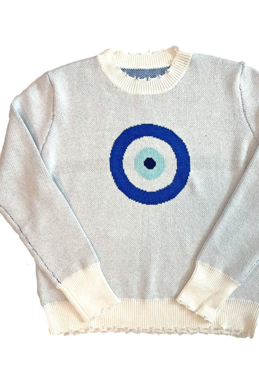 ** Exclusive In-House Design **- Evil Eye intarsia- Tattered details at hem, cuffs and collar