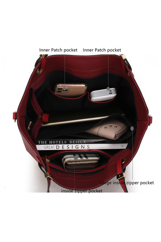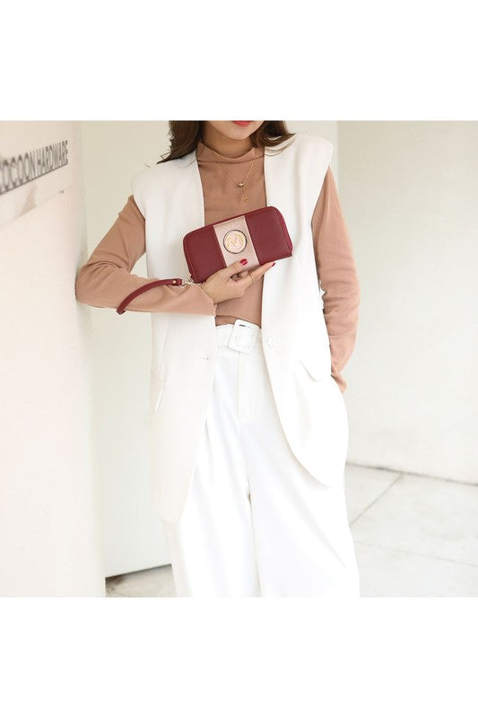 Interior details: Two slip pockets and a wall zip pocket. Center zip compartment.