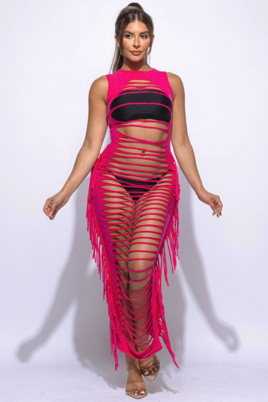 This maxi dress stands out for its eye-catching fringe and cut-out details, offering a unique and fashionable look. The vibrant hot pink color adds a playful and energetic touch, making it a standout piece for any event.