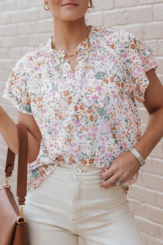 This top is a must-have for adding a touch of flirty floral fun to any outfit. Made from soft, lightweight fabric, it's adorned with vibrant multicolor flowers that are sure to catch everyone's eye. The silhouette is both flattering and comfortable, with an elegant mandarin collar, half button-front design, and playful ruffle sleeves. Try pairing it with light wash jeans for a spring-ready look that's effortlessly stylish and uniquely you!
