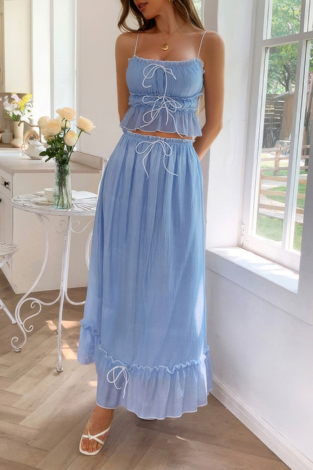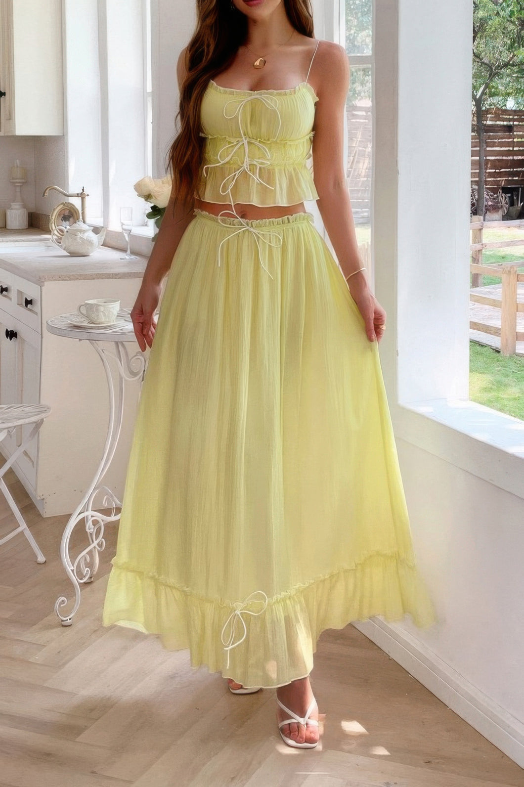 Add a touch of feminine charm to your wardrobe with this two-piece frill square neck cami and ruffle hem set. Crafted from a soft blend of 85% Lyocell and 15% Polyamide, this set offers a lightweight, breathable feel that's perfect for warmer days. The square neckline with delicate frill detailing enhances the playful cami, while the matching ruffle hem skirt brings movement and grace to every step. Ideal for a variety of casual occasions, this set combines comfort and style effortlessly. Whether you're heading out for a brunch, a stroll, or a sunny getaway, this ensemble delivers an easy, polished look.