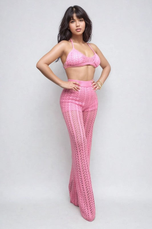 Get ready for sun-soaked days in this adorable pink crochet two-piece set! Featuring a classic triangle halter top with adjustable ties for the perfect fit, paired with matching high-waisted, wide-leg pants. The open-weave crochet design is breezy and perfect for layering over your favorite bikini. Whether you're lounging poolside or heading to a beach bonfire, this set brings playful, feminine vibes.